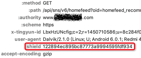 所以Hook okhttp3.Request$builder的addHeader或者header方法,当addHeader或者header第一个参数是shield的时候,取出第二个参数的值即为shield的值。