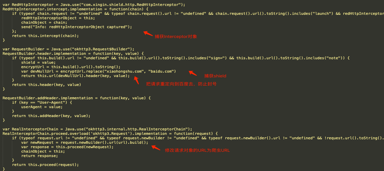 这里边有个骚操作就是,在执行intercept方法的时候,我们的请求会到服务器,为了规避风险,可以在获取完shield之后更改下URL的host,把请求送去百度。