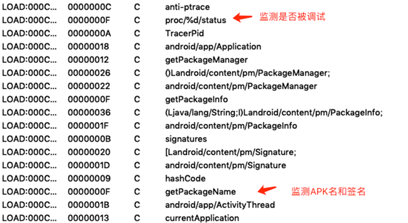 将修复好的so文件拖入IDA,习惯先按下shift+F12查看so中的所有字符串,可以发现这次字符串都正常显示了。