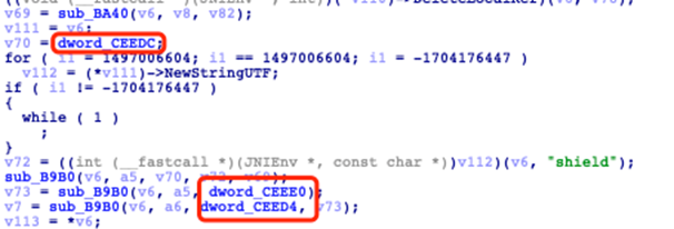 定位到sub_c968,按下F5,转换下JNIEnv。这里边代码比较清晰,找到shield附近。