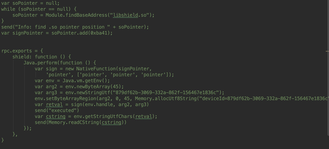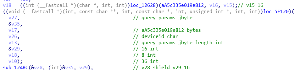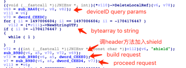 至此,可以分析出是sub_BA40接收deviceId和请求参数,然后一顿运算生成出了shield,那么Hook该函数能非常高效地获取到shield了。