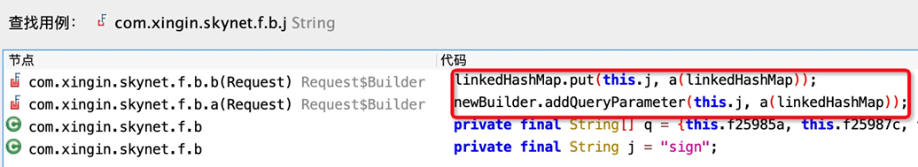 可以看到这里边有linkedHashMap,put方法key是“sign”,value很像是对linkedHashMap的加密。下边的调用也类似。