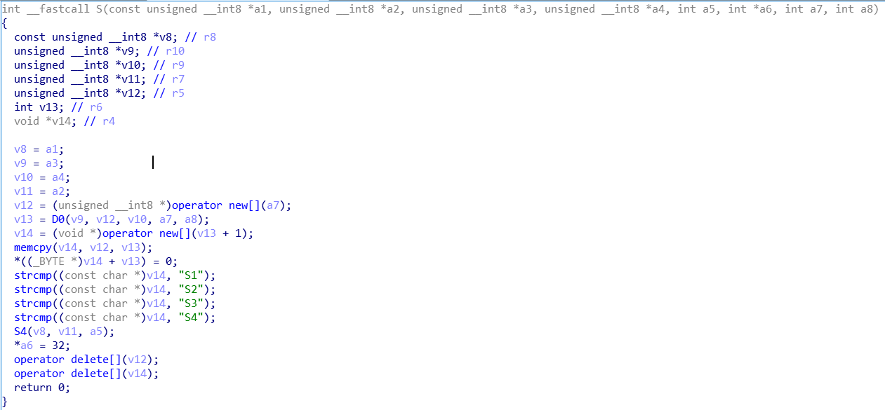 重新定位到之前的5F120函数,在这里是S函数,里边D0函数对应的就是原so的5E860,S1-4函数对应的是5E918-5ED60。