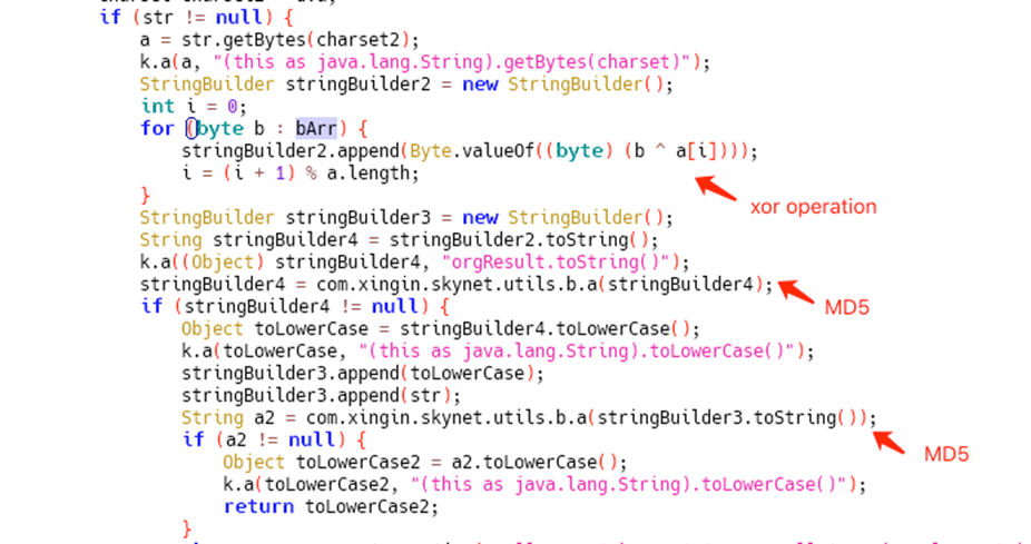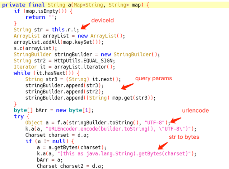 可以发现,a方法其实就是把请求参数转化为byte数组,并做异或操作,最后MD5。